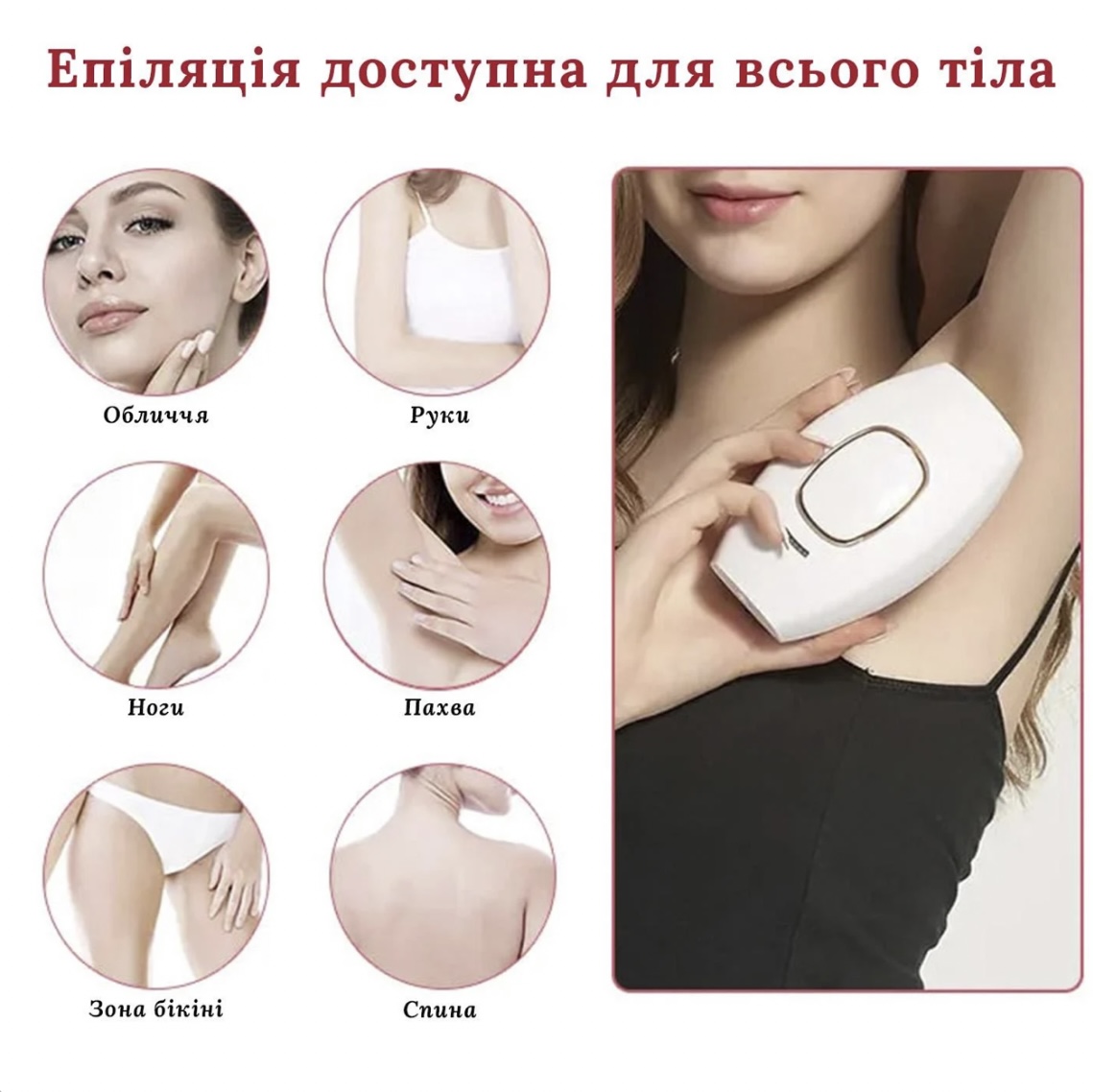 Епілятор підходить для всіх ділянок шкіри, а також однаково ефективно бореться як зі світлим так і з темним волоссям. Також IPL вплив ефективний у видаленні пігментних плям. Вже за кілька процедур ви помітите поліпшення, оскільки імпульси світла мають руйнівний вплив на причину пігментації шкіри – меланін.